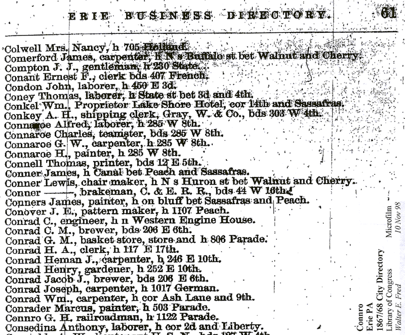 George and Elizabeth Connaroe children appeared to have remained in the Erie and Chautauqua County area. Angeline (1837-1912) married John McManus (wheelwright and postmaster) and lived in Belle Valley outside Erie. They are both buried in Trinity Cemetery. George Henry (c 1840-bef 1900) married Mary Jane (Jennie) Canfield in Cleveland, Cuyahoga Co., Ohio. "Henry" transitioned from being a painter to a brakeman with the railroad and died sometime before the 1900 Census. His wife Mary Jane can be found in Cleveland from 1900 until her death in 1922. George "Henry" likely died at a young age and may be the George Conroe who died in 1872 and is buried in Erie Cemetery. William H. Connaroe (1845- ) married Gertrude (1845- ) in circa 1869. They settled down in Harbor Creek, Erie Co. PA and then moved to nearby Ellicott, Chautauqua Co. New York. After working as a painter, William became a “cabinet maker” and later worked in a “marble works.” The two youngest known children are the twins, Albert Charles (1847-1897) and Alfred C. (1847-1903). Albert, also know as “Charles,” started out as a painter and is also seen as a “paper hanger” and general laborer. Charles' whereabouts are unknown during the late 1870s and early 1880s. Towards the end of his life, he lived with his mother in Erie City and appears to have died unmarried at his sister Angeline's home only seven months after his mother’s death. His twin brother Alfred also started out as a painter in Erie. After marrying Mary Schnieder in circa 1871 they moved out to Venango, Erie Co. to do a little farming. He moved back to Erie as a carpenter in circa 1881 where he remained until after his wife Mary's death in 1895. He appears to have moved to Cleveland, Cuyahoga Co., Ohio shortly before his death in late 1903.